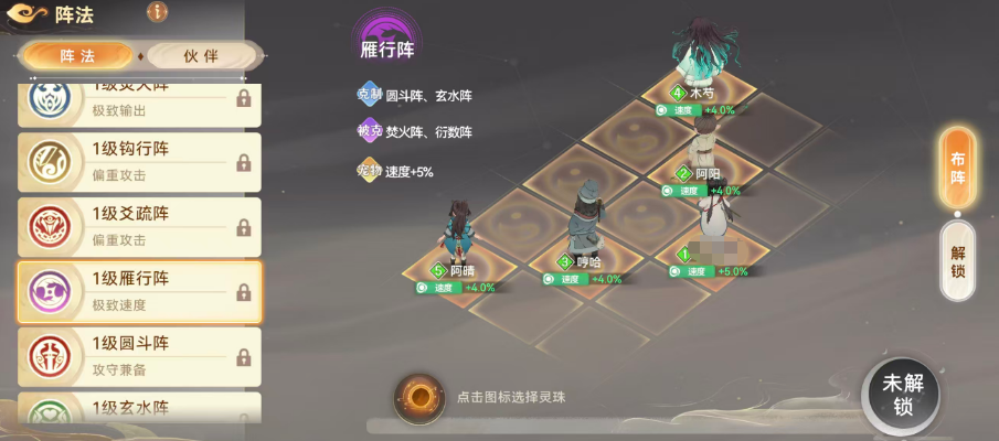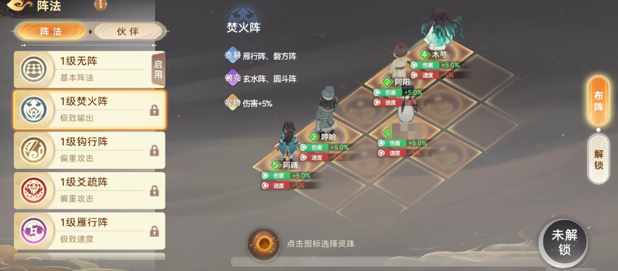 以“焚火阵”为例,其克制目标为雁形阵与磐方针,但自身被玄水阵、圆斗阵反制。启用该阵时,所有宠物基础伤害提升5%。阵法等级可通过消耗对应名称的阵法书进行升级,等级越高,面对克制型敌阵时的压制效率越显著。当解锁灵珠槽位后,还可镶嵌灵珠进一步强化属性加成。若侧重输出能力构建,钩行阵与爻疏阵均为优选:钩行阵提供全体伙伴4.2%增益(辅助类伙伴为4%);爻疏阵则给予伙伴5%加成,宠物获得2.5%攻防提升——综合数值表现,爻疏阵在角色战力增幅方面更具优势。