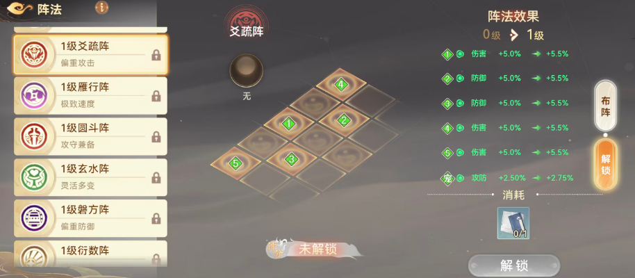 追求速度优势的玩家可选用雁行阵:宠物速度+5%,伙伴速度+4%,主角速度+5%,为全阵法中速度增幅最高者。若倾向均衡发展,圆斗阵是经典之选——前排角色伤害+5%,主角(竖排中位)防御+6%,后排辅助角色速度+4%,宠物伤害+5%。该阵法依据角色职能与站位精准分配属性,契合职业特性,适合过渡期稳定输出需求。