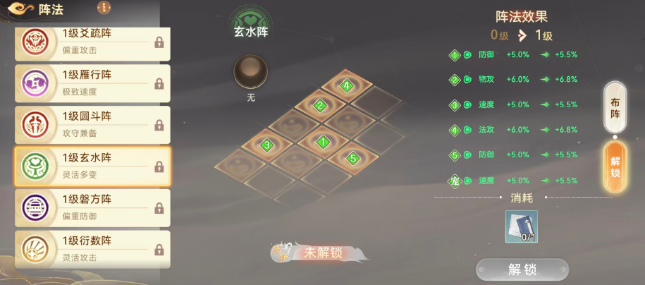 强调战术灵活性的布阵方案中,玄水阵尤为突出。其独特布局将一名角色独立置于突袭位,获得5%速度加成;辅助角色移至侧翼以强化法术攻击;前排角色则获得6%物攻提升;主角防御+5%。该阵法通过差异化定位设计,使队伍在多变战场中具备更强应变能力与战术纵深。
