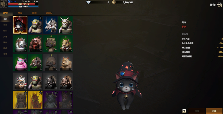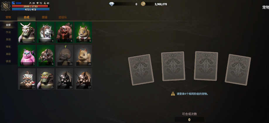 宠物按稀有度划分为蓝、红、紫、金四档,对应基础、精良、史诗、传说品质。品质直接决定属性加成幅度,是战力构成的关键变量。品质突破依赖合成机制:4只蓝色宠物可合成1只红色;4只红色合成1只紫色;而2只紫色即可合成1只金色宠物。该数值规则不可更改,为游戏内固定设定。