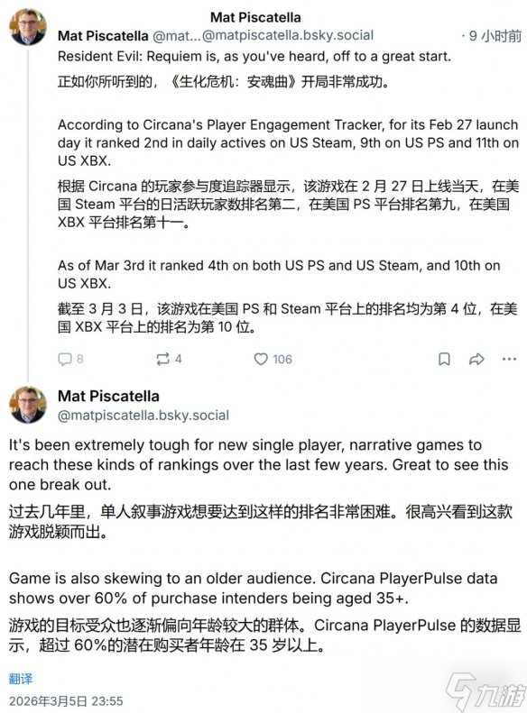 Circana游戏行业执行总监Mat Piscatella在3月5日发文指出,近年来单机叙事类游戏普遍表现平平,但《安魂曲》成功突围,其玩家群体也呈现出明显的“老龄化”特征。自1996年首作问世,《生化危机》系列已走过近三十年,早期粉丝如今大多步入中年,具备稳定的消费能力,也展现出经典IP的长尾号召力。