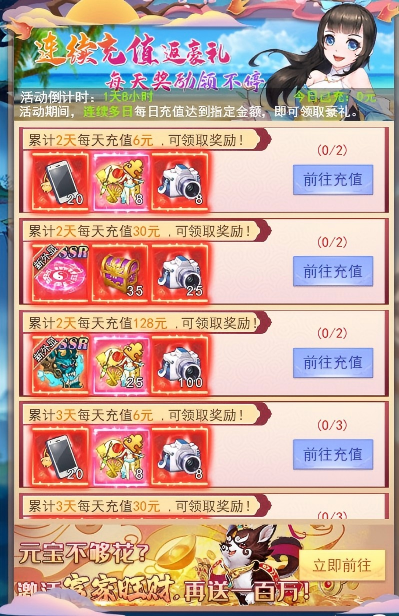 1、 活动期间内,连续充值的天数和金额均达到要求即可领取对应档奖励