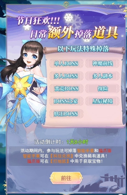 2、 涉及的玩法有:单人boss、多人boss、妖王boss、蛮荒boss、boss之家、神魔前线、多人副本、探险,星辰秘境