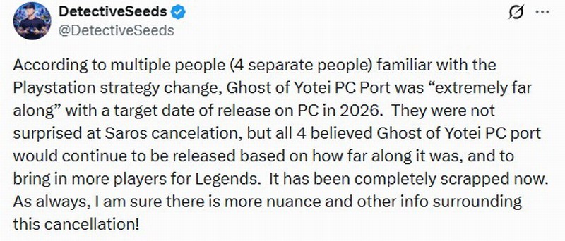 DetectiveSeeds说:“据四位了解索尼PlayStation战略调整的知情人士透露,《羊蹄山之魂》PC版开发进度已进入收尾阶段,原计划于2026年登陆PC平台。此次项目取消的背后,想必有更多细节与隐情。”