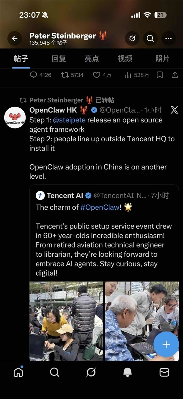 连OpenClaw创始人Peter都亲自转发感叹:“在中国,龙虾的接受度已经到了全新层级。”
