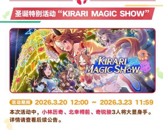 "KIRARI MAGIC SHOW"活动页面将正式公开,届时训练员们可以前往专属页面查看活动详情、进度以及各类福利信息,一站式掌握所有圣诞活动内容。