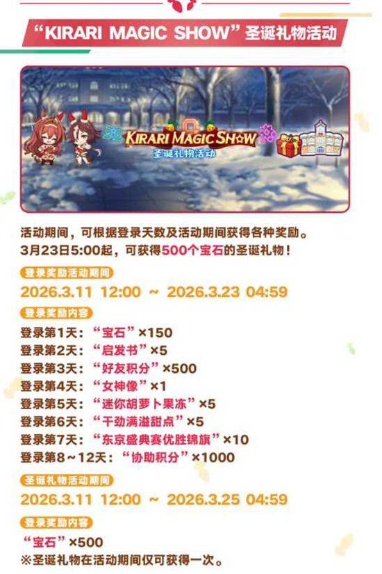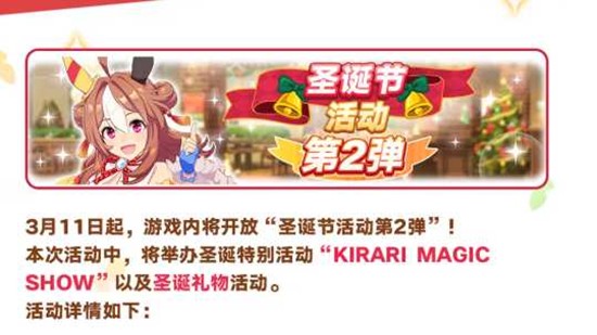 同时,"KIRARI MAGIC SHOW"圣诞礼物活动也将同步开启,训练员们可以通过参与活动赢取丰厚的节日限定奖励。