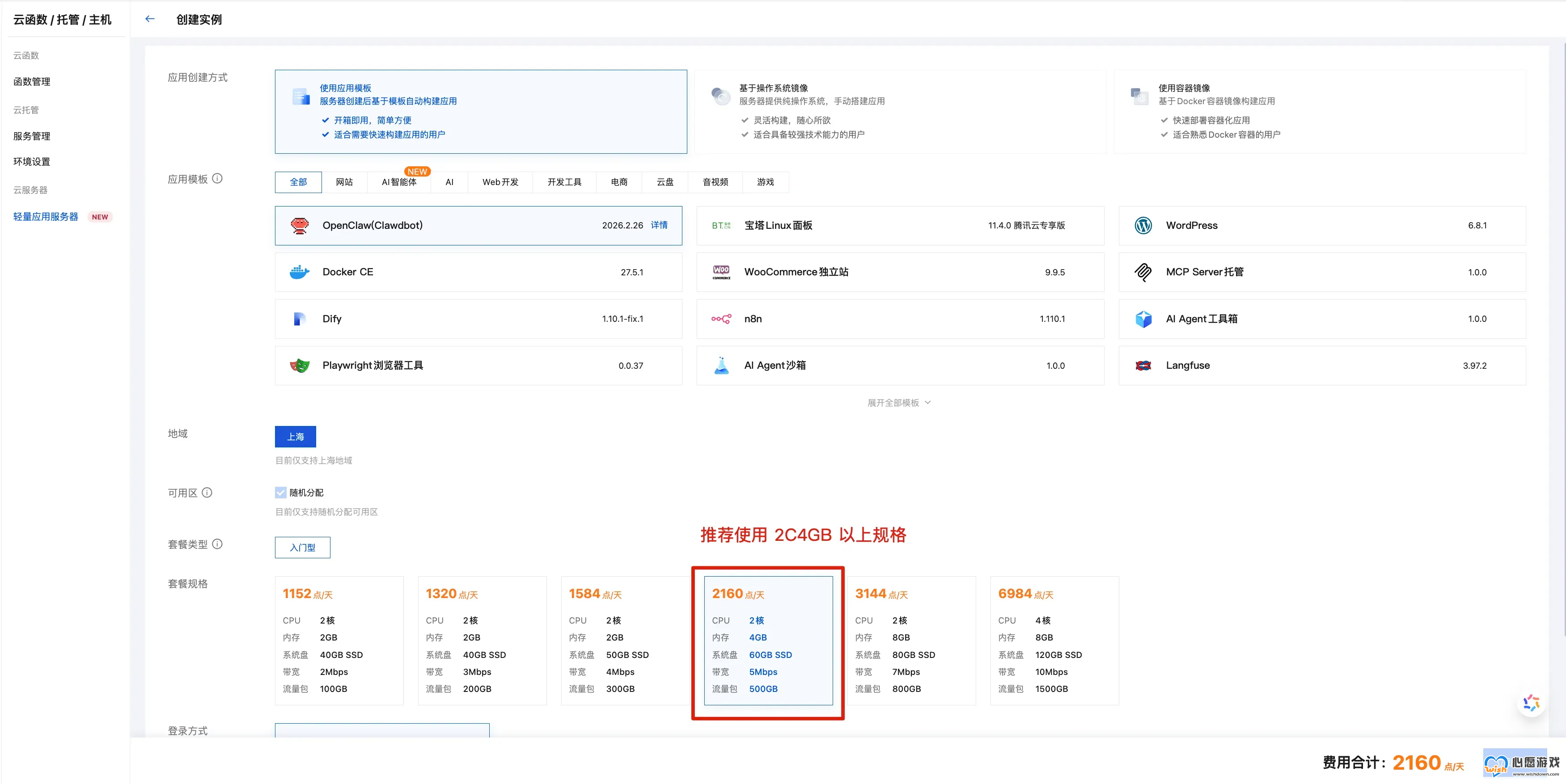 套餐配置:选择 2C4G 及以上(很重要!低配会卡死)