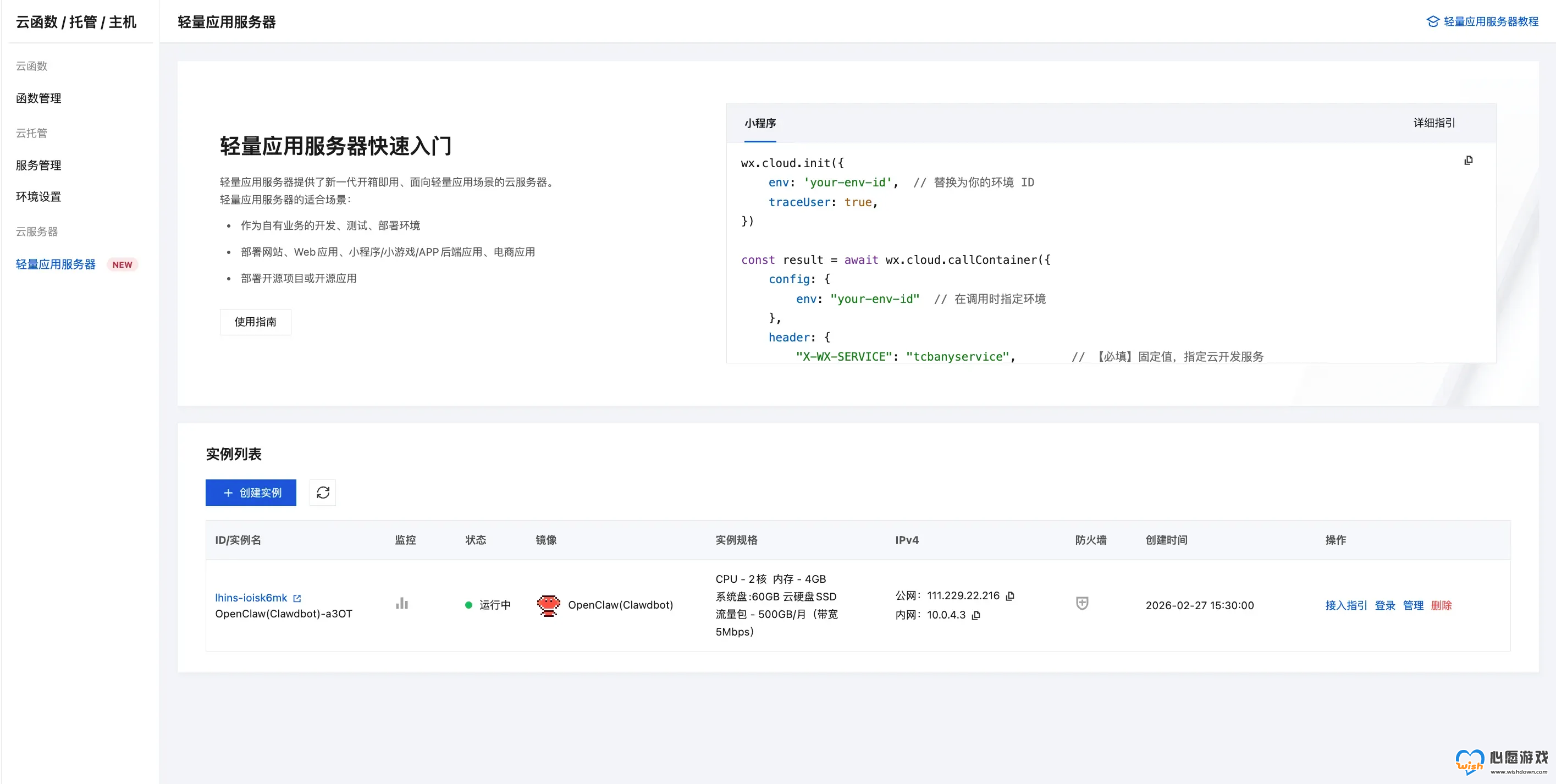 进入「云函数/托管/主机」→「云服务器」→「轻量应用服务器」