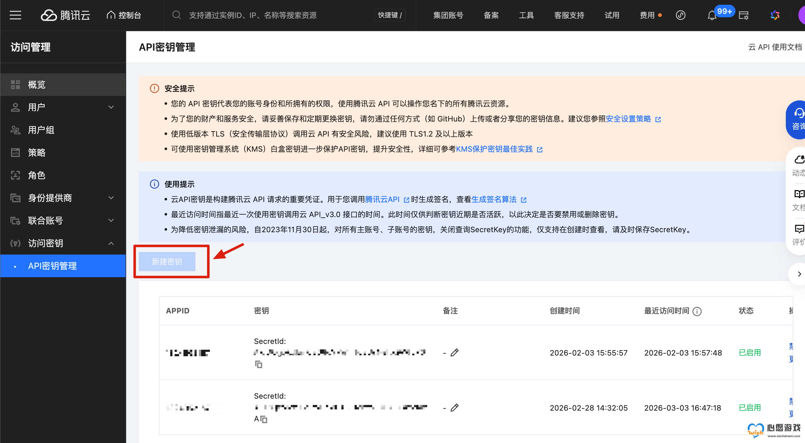 登录 访问管理控制台 → 创建密钥 → 获取 SecretId 和 SecretKey