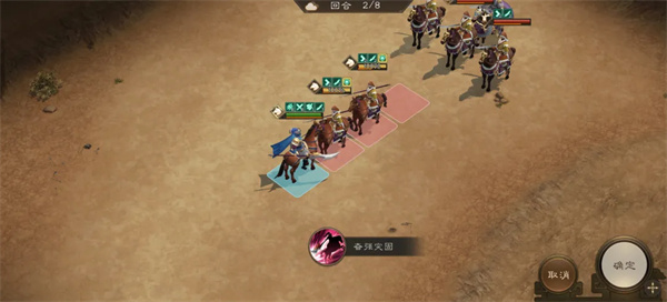 回合开始张辽移动到下图位置开技能无坚不陷攻击全部敌人,利用张辽的被动技能斩杀第一排敌人。
