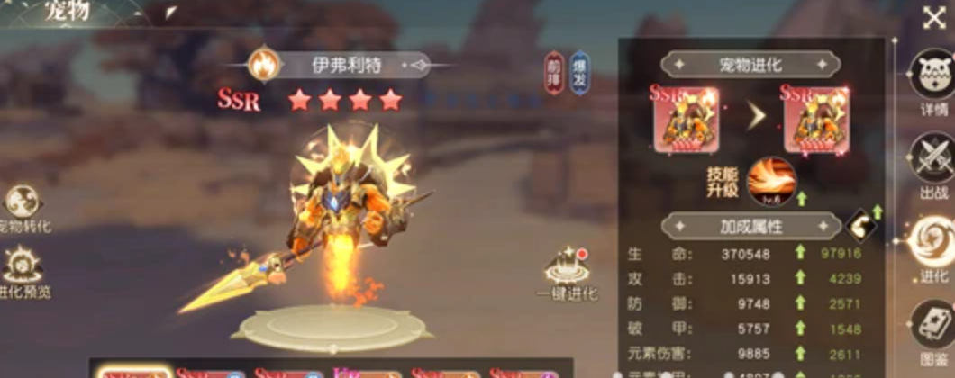 值得注意的是,星级上限并非自然解锁。当宠物达到当前星级瓶颈后,必须通过“进化”系统进行突破。该过程要求以本体宠物为承载体,并消耗一只完全相同的高稀有度宠物作为进化媒介。由于高星同名宠物获取难度大、产出周期长,玩家需科学规划资源投入节奏,在主力阵容成型窗口期前完成关键宠物的升星布局,避免因材料错配导致战力断层。