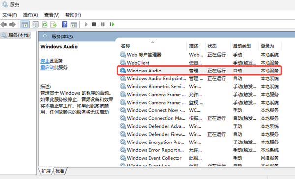 2、找到Windows Audio服务,确保服务状态为正在运行。