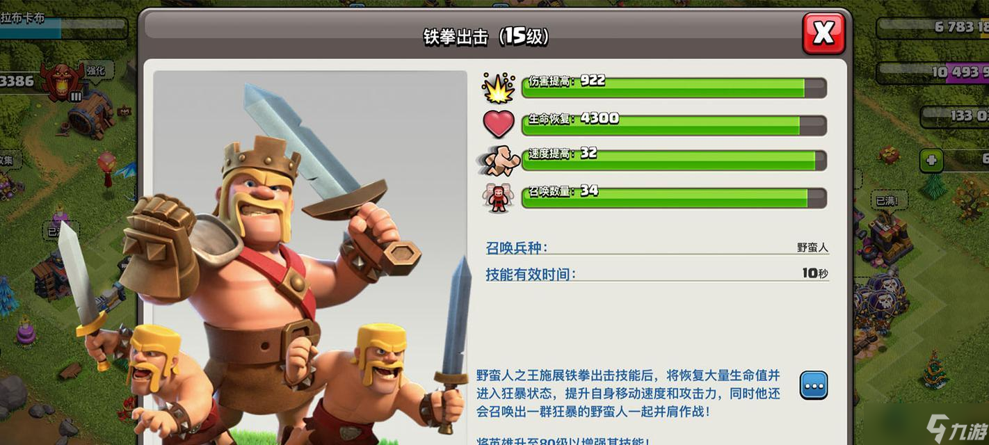 部落城堡中的援军:蛮王的高血量和强大攻击力能够迅速消灭敌方援军。