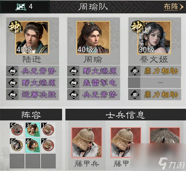兵种站位:在蔡文姬的上方放置一个五斗米祭;在陆逊和周瑜的前方,各放置一个藤甲兵。
