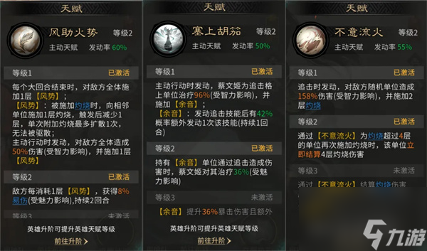 周瑜的天赋【风助火势】,在主动行动时发动,对敌方全体造成伤害并施加【风势】,在大回合结束时还可额外施加一层【风势】。当敌方目标被施加灼烧后,可以给相邻单位施加一层灼烧;消耗【风势】还会为目标施加8%易伤。