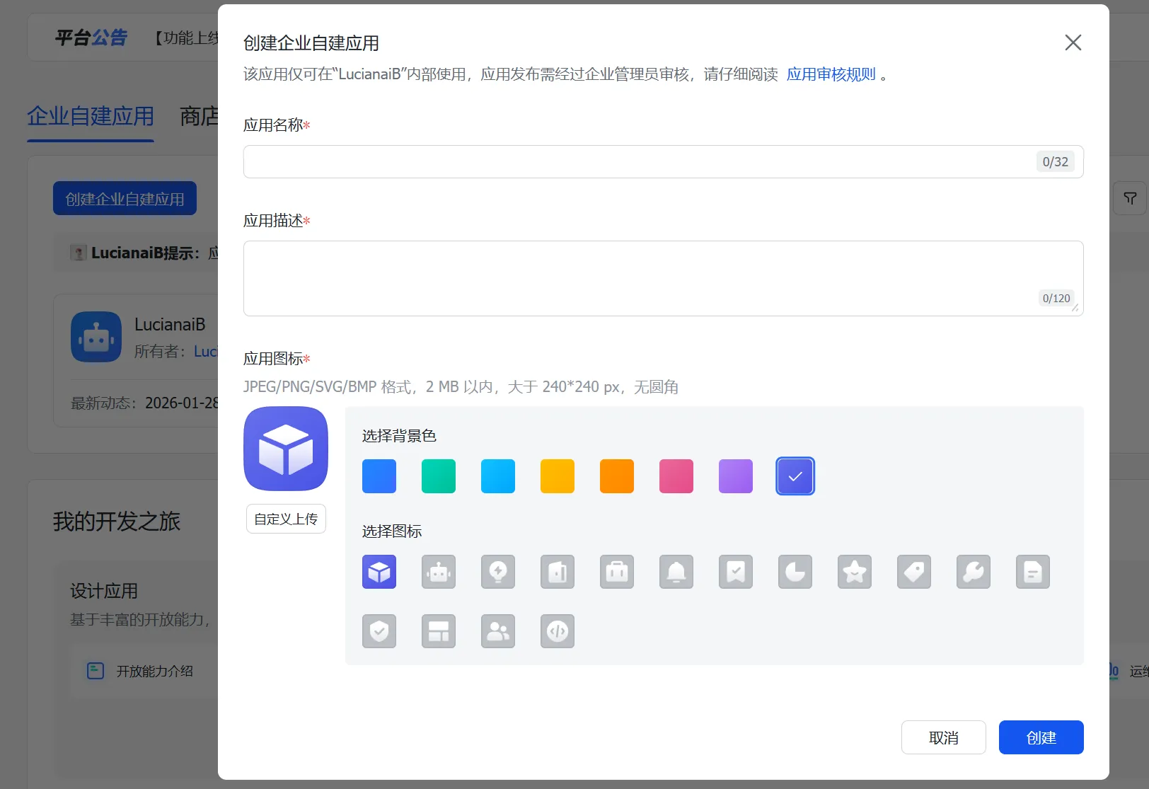 1.打开飞书开放平台配置:https://open.feishu.cn/app,新建一个,输入相关信息。