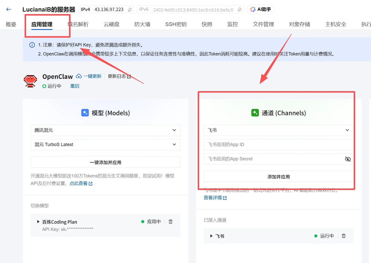 在通道中选择飞书,然后把上面获取的App ID和App Secret输入,点击添加并应用,就可以看到添加成功了。