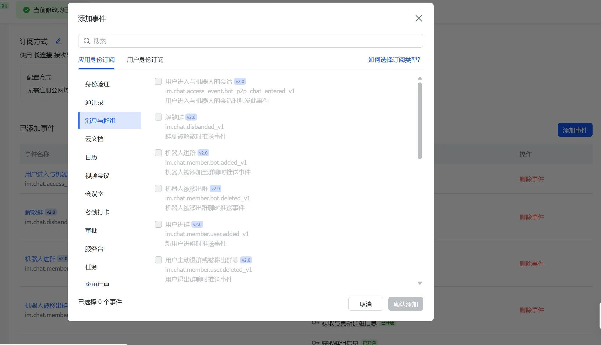 然后在添加事件中的消息与**群组事件**全部勾选即可。