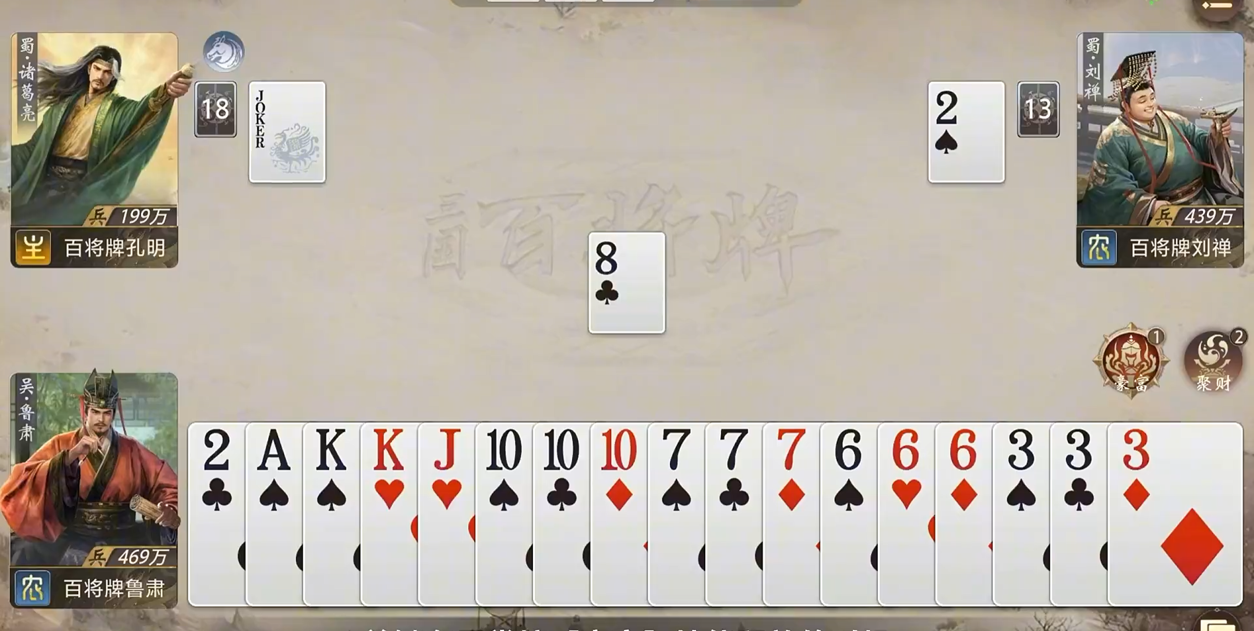 操作技巧上应该按照对局环境选择技能释放的时间。主动进攻时留出关键点数或者同点数牌,用【豪富】准确补齐手牌,形成炸弹或者高点组合;防守时注意对手出牌情况,先挑对己方有利的底牌,把零散的小牌留给对手,创造出手牌结构上的优势。另外,在决战残局的时候,鲁肃的技能可以成为重要的翻盘点,用补牌干扰敌人的收尾,延缓敌人的出牌速度,给己方争取机会。