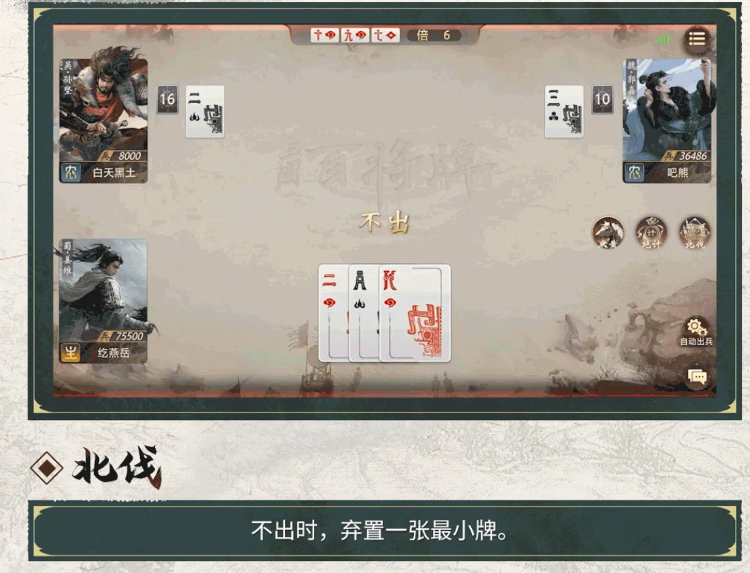 姜维的核心技能可以分为两大部分。其一就是“北伐”,当轮到姜维压牌的时候,如果选择不压,就会自动弃置手中点数最小的牌,直到只剩一张手牌为止。该机制可以迅速减少手牌的数量,给后面技能的使用创造条件。第二是绝计,当姜维手中的牌只剩一张并且不压牌的时候,这张牌会随机变大,如果是大王的话就会变成四张3点牌。变牌效果非常强烈,对手在最后阶段不得不考虑可能的逆转,心理压力大、操作难。