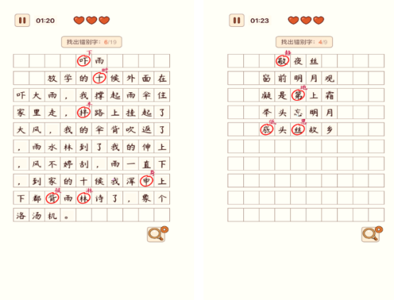 以语文核心素养为设计导向的文字辨析类游戏。题库覆盖小学阶段常用诗词、成语及课标字词,玩家需在限定文本中精准识别错别字。界面采用清新美术风格,适配7–12岁儿童视觉偏好;关卡难度梯度设置合理,兼顾识字巩固与细节观察力培养。