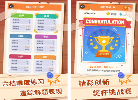 经典数独规则的儿童友好化改编版本。全免费开放,无广告干扰与付费解锁机制。设6级难度体系,从4×4入门格逐步进阶至标准9×9布局;强调行列与宫格数字唯一性逻辑,同步支持奖杯成就系统,助力抽象推理与空间规划能力发展。