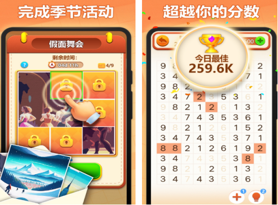 基于数字关系匹配的休闲解谜游戏。玩法核心为:在网格中寻找两个数值相等或相加得10的相邻数字进行消除。无时间压力设定,关卡总数超1000关,适配不同熟练度玩家;通过反复观察与模式识别,潜移默化提升心算速度与数字敏感度。
