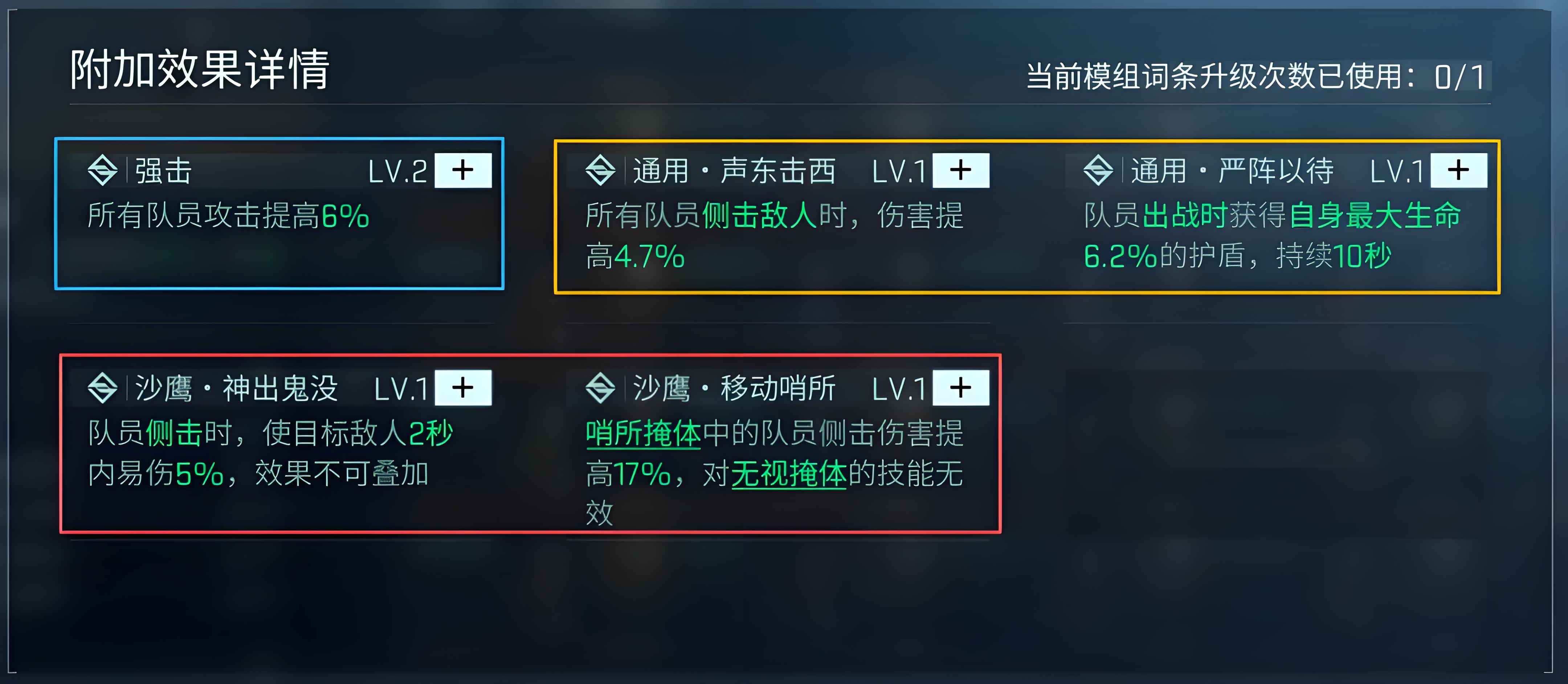 当增强模组之后就将会获得三层buff加层,第一种是不需要任何的抽奖和刷怪,全队就可解锁沙海守望者、游击掩护和游击防卫队三类增益效果,能够极大的提高掩体和攻击效果。第二种是获得声东击西、神出鬼没、移动哨所、强击和严阵以待等加成效果,可提高队友的6%强击和5%的内易伤,还能获得生命护盾。第三种就是队员获得额外的防御、攻击和生命值加成。