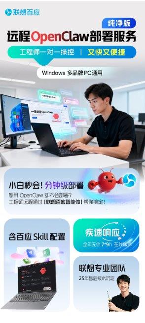 消费者下单该服务后,京东平台的认证工程师将为Windows用户全程远程代操作,30分钟内快速完成配置,规避部署过程中可能出现的各种技术漏洞,且全过程透明可追溯。部署完成后,即使没有任何技术背景的普通打工人、自媒体创业者或中小企业团队,也能在5分钟内上手操作,一键解锁OpenClaw在代码编写、文档处理、邮件整理等日常办公场景中的核心能力。京东专业工程师还将为用户预装联想百应特有的AI服务及办公Skills,提供定制化的一键安装方案,让AI辅助体验更加流畅智能。