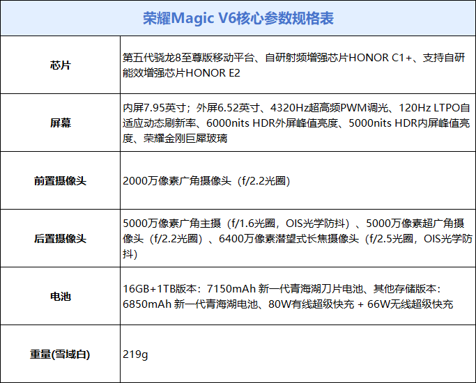 通过在性能、防护、影像与续航上的全方位堆料,荣耀Magic V6成功终结了折叠屏的配置妥协,成为一款真正意义上的全能“大满贯”旗舰。