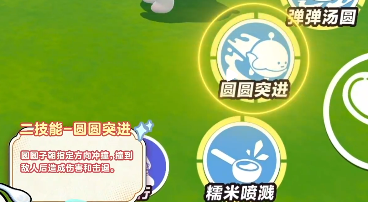 先说圆圆子的被动,叫甜甜补给。这个机制比较特别,技能打到敌人之后,会在自身附近掉落糯米块,然后圆圆子可以捡起来回血。也就是说,只要技能持续打到人,就能一边打一边补血,续航能力很强。更有意思的是,圆圆子的血量越高,体型就越大,技能的覆盖范围也会跟着变大。所以保持高血量不只是为了活得久,还能让技能打出更大的效果,两件事是连在一起的。