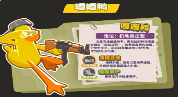 但是在团队作战的时候效果却十分关键,有这个角色在场,能让队伍整体的节奏更稳定。需要快速调整位置的时候,这个加速效果也可以发挥出比较大的作用,它自身的作战能力比较弱,在实战中一定要多加注意站位的问题,不能冲到队伍最前面承受攻击。除了这个角色之外,游戏中的嘎嘎鸭角色其实也是非常值得大家去体验的,这个角色拿着锅盖就可以参与对战了,形象非常有趣,在实战的过程中能力也是非常强的。