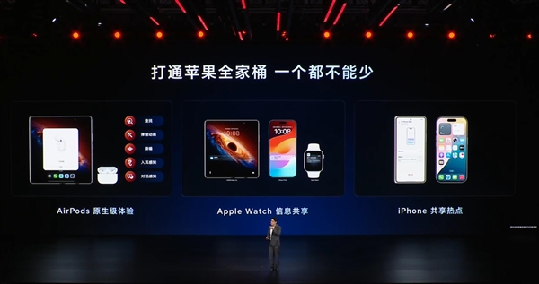 在软件生态上,荣耀实现了跨越式的突破。荣耀Magic V6全面打通了苹果生态,能与Mac无缝连接,实现通知共享和笔记同步。它还能与iPhone互传文件,甚至能让苹果手表查看两部手机的消息。
