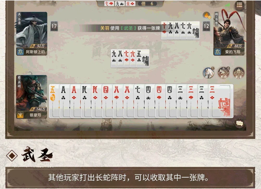 关羽的被动技能同样以“长蛇阵”为触发条件:当敌方打出连续点数牌型时,关羽可从中选择一张加入己方手牌。这一机制不仅实现资源二次转化,还同步削弱对手的手牌结构完整性。技能生效逻辑清晰,但实际运用中需结合回合阶段、剩余手牌构成及对手可能的后续动作进行预判——例如在关键压制轮次优先截取高价值单牌或衔接顺子的关键中间牌,从而构建下一轮强势出牌链。