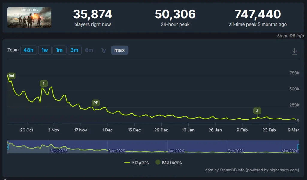 截至发稿,《三角洲行动》Steam在线玩家数为122,480人。而《战地6》只有35,874人。就连被不少人唱衰的Bungie新作《马拉松》,在线人数也快追上这款号称要“复兴老牌射击系列”的作品了。