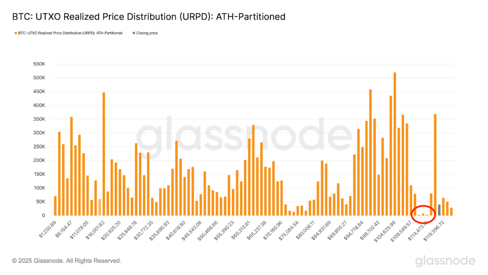 - 潜在下行风险: 链上数据表明,由于在112,000-115,000美元区间缺乏累积仓位,价格可能下跌至该范围。