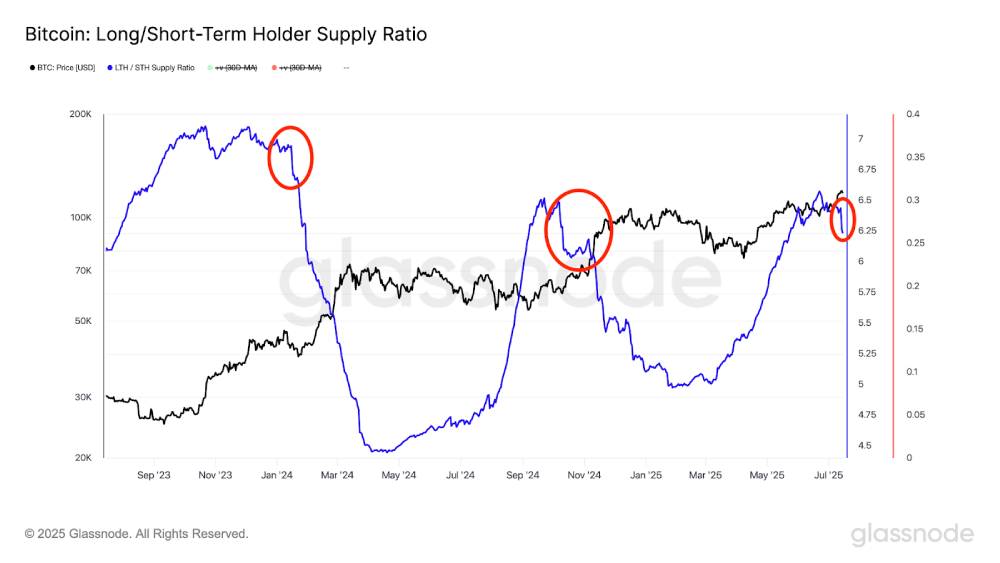 此外,虽然如上所述,长期持有者的抛售带来了压力,但历史模式表明,这种活动并不总是导致价格立即崩溃。长期/短期持有者供应比率这一链上指标表明,当长期持有者卖出时,短期持有者通常会介入吸收供应,从而稳定甚至提升价格。这种动态在2024年1月(见下图左侧红圈)首个比特币现货ETF获批时引发短期买入时明显可见,以及在2024年11月(见下图中间红圈)与选举相关的乐观情绪推动资金流入时也是如此。当前数据显示长期/短期持有者供应比率正在下降(见下图右侧红圈),表明短期持有者再次进入市场,可能抵消了卖出压力。结合围绕美国加密货币周的积极情绪,这可能推动比特币达到新高。