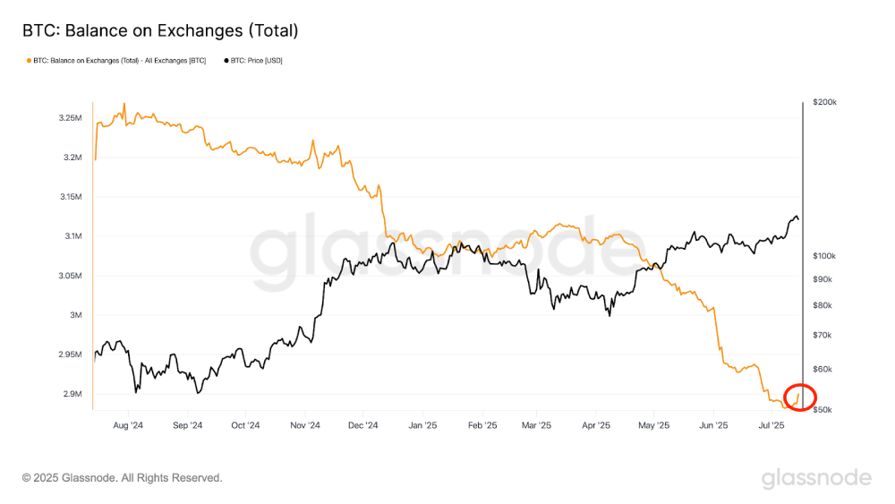 最近在123,000美元的历史高点引发了长期比特币持有者的显著活动,特别是一位已沉寂14年的知名鲸鱼。该鲸鱼转移了约80,000枚比特币,其中40,000枚比特币于2025年7月15日转移至Galaxy Digital进行清算。这一事件催化了更广泛的抛售压力,其他长期持有者也纷纷效仿。链上数据显示,交易所的比特币余额明显增加(见下图红圈),从2025年7月14日开始的一天内,约有13,000枚比特币被转移到交易平台。