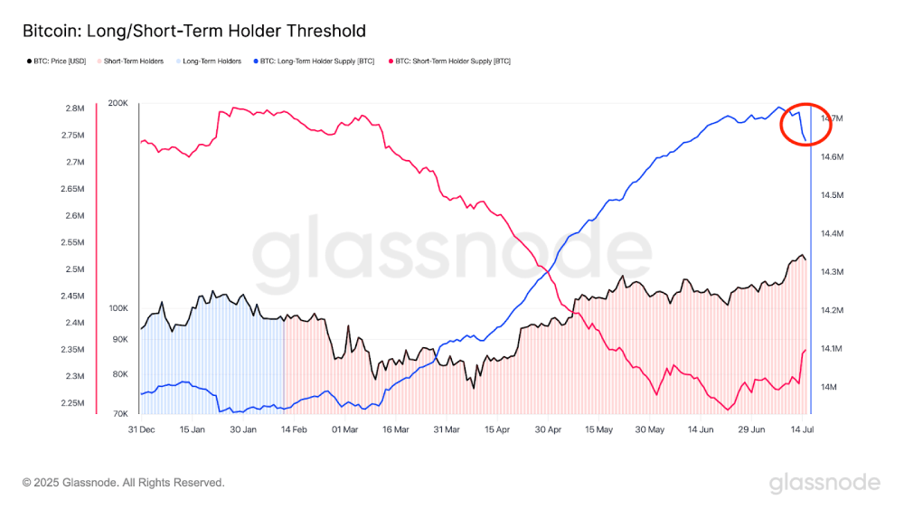 此外,从7月13日开始的两天内,长期持有者持有的比特币总量减少了近75,000枚(见下图红圈),表明在这些高价位进行了获利了结。