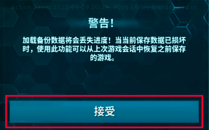 确认操作后,系统将弹出提示:“当前保存数据已损坏,使用此功能可从上次游戏会话中恢复之前保存的游戏”。该提示属于正常存档覆盖校验流程,点击“接受”即可激活自动存档机制。需特别注意:风神翼龙与南方巨兽龙的刷新机制严格绑定起始位点坐标,务必全程固定使用“孤岛”作为唯一测试地图,否则将导致生物刷新率异常波动,影响刷取效率。