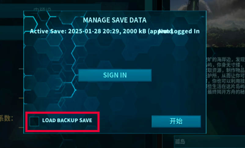 若首局探索未达成目标资源采集或恐龙驯服需求,需执行存档回溯操作:退出当前游戏返回主菜单→再次点击“孤岛”地图→在弹出的启动界面左下角勾选“Load backup save”选项→点击“开始”。此时系统将触发存档恢复协议。