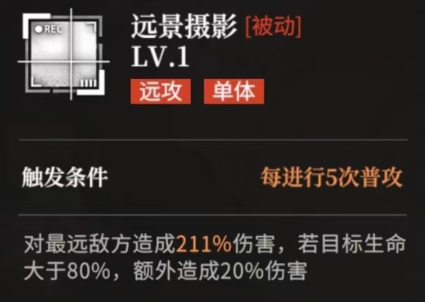 其被动“远景摄影”每完成5次普通攻击后触发,锁定场上距离最远的敌方单位造成高额伤害;若目标当前生命值高于80%,额外提升40%伤害。大招“瞬间定格”为圆形范围伤害技能,对区域内所有敌人造成大量物理伤害;每次命中处于重伤状态的目标,均可使下次大招能量消耗减少1点,最多减免2点。由此可知,该角色本质是体系型收割者:依赖队友制造重伤/低血量环境,自身承担终结环节,而非全程主导输出节奏。因基础生存属性偏低,必须严格置于中后排位置,避免直面前排集火。