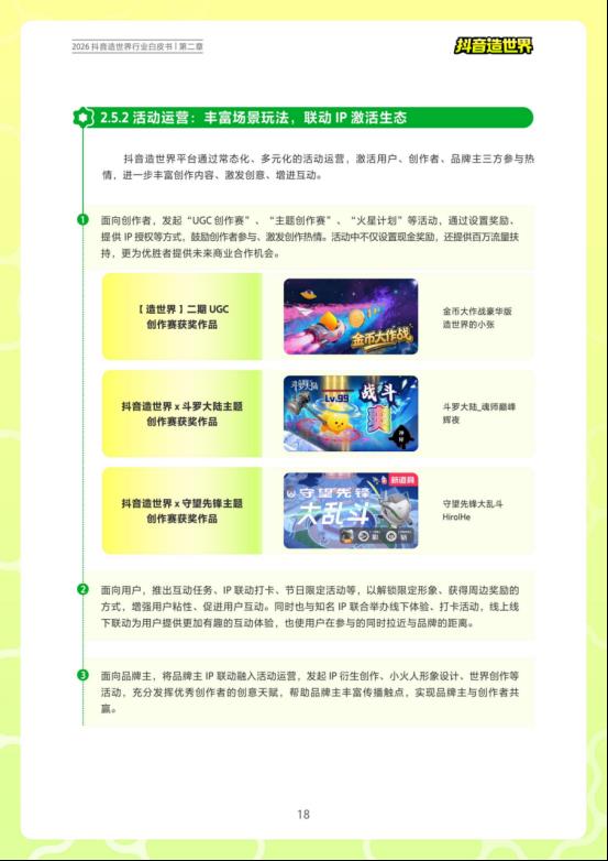 2026年3月7日,抖音造世界联合极光月狐发布了《2026抖音造世界行业白皮书》。梳理了国内市场UGC创作生态的整体现状、各个细分赛道的发展概况、以及抖音造世界在新赛道UGC互动社区中的成长表现。报告围绕抖音造世界生态的四个核心环节展开,包括:用户需求及行为偏好,各类创作者发展现状,品牌及IP合作模式,平台技术、流量、商业赋能等,为创作者和品牌主提供参考。总体来看,抖音造世界生态正处于高速发展阶段,凭借其生态优势,为创作者提供低门槛、高潜力、高价值的内容创作空间,实现用户、创作者、品牌主共赢。