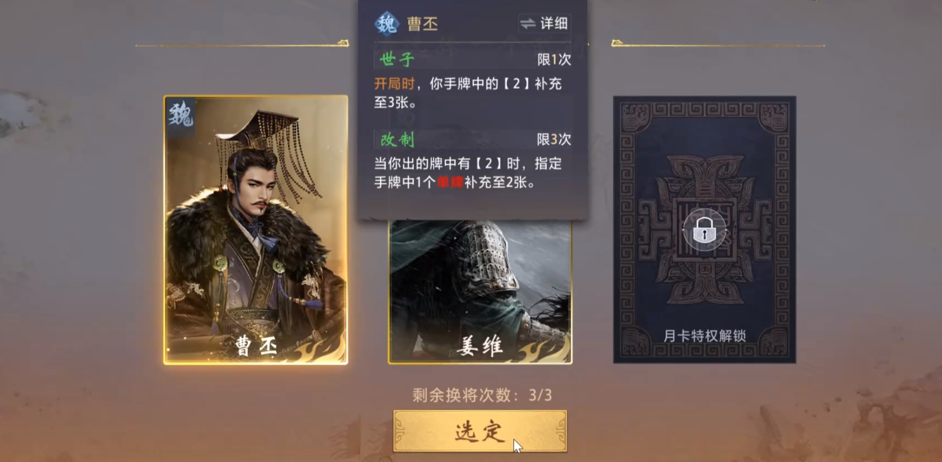 第二个t1英雄曹丕,完成七天签到任务就可以获得。他的技能效果是开局就可获得三张2,出2可将任意单牌变成对子,这个机制在常规局中可以说是非常适合控场的存在。