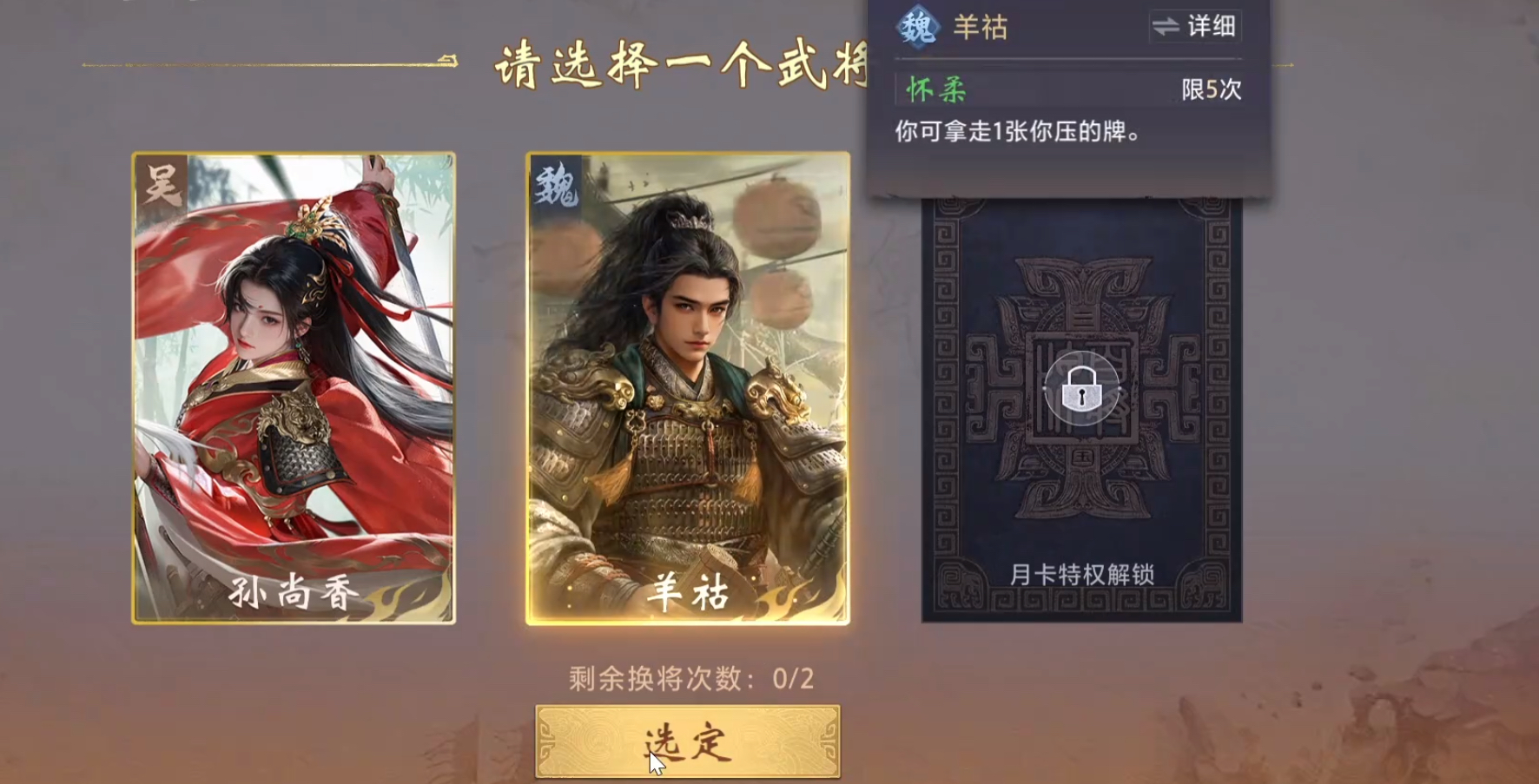 第四个t1英雄羊祜,消耗688金饼在商店中购买获得。他的技能效果是当我们压牌时,可以获得被压方的牌,限五次。这个技能的妙处就是我们可以根据自己的手牌来决定要拿什么样的牌,比如可以是顺子,也可以是炸弹。