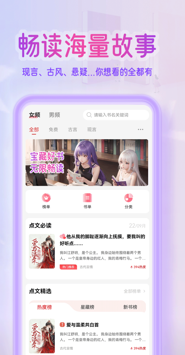 聚焦女性向内容生态,同步上线《龙族》系列中高人气支线与衍生作品,如《龙族Ⅳ奥丁之渊》《龙族Ⅴ悼亡者的归来》等,版权链路清晰可溯。平台设置“新书速递”“热度TOP20”“读者催更榜”三大榜单,方便追踪连载动态。每章末尾嵌入实时段评区,支持即时互动与剧情解析,增强沉浸式阅读体验。阅读设置涵盖多档蓝光衰减强度、字体渲染优化、语速分级听书,尤其适合晚间放松式阅读场景。