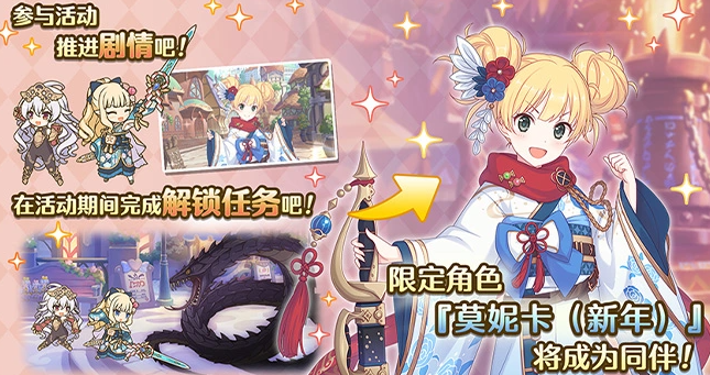 为配合限定角色登场,官方上调了活动奖励结构。自报酬列表第6档起,所有宝箱均固定包含「新年莫妮卡」碎片。角色实装后,其专属条目将同步上线女神石商店。目前该角色共追加4话个人剧情:首话自动解锁;第二话需角色好感度达4级;第三话需好感度达5级;第四话则需提升至8级。好感度升级规则与其他角色完全一致。另需注意:观看全部新年莫妮卡剧情前,必须先通关游戏终章主线内容。