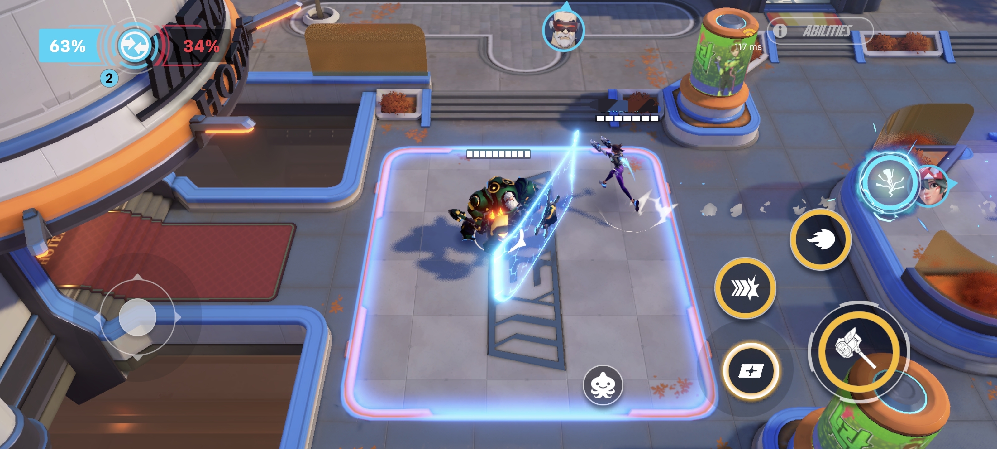 操作逻辑上,游戏采用双区域触控方案:左侧虚拟摇杆负责角色位移,右侧按键集中管理技能释放与主武器射击。该布局显著降低多指令并发的操作门槛,使裂空的“闪回”位移、士兵76的“战术目镜”精准瞄准、莱因哈特的“冲锋撞击”突进等高价值技能更易衔接。但技能生效仍高度依赖时机预判与团队站位配合——例如前排坦位需为后排输出创造安全窗口,辅助角色需同步跟进治疗链与机动支援。