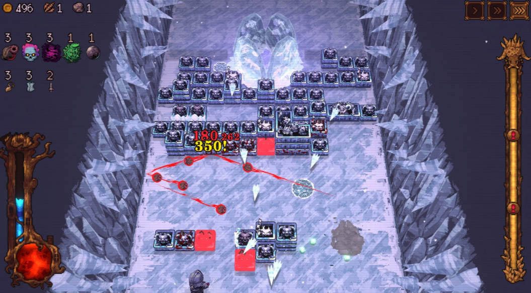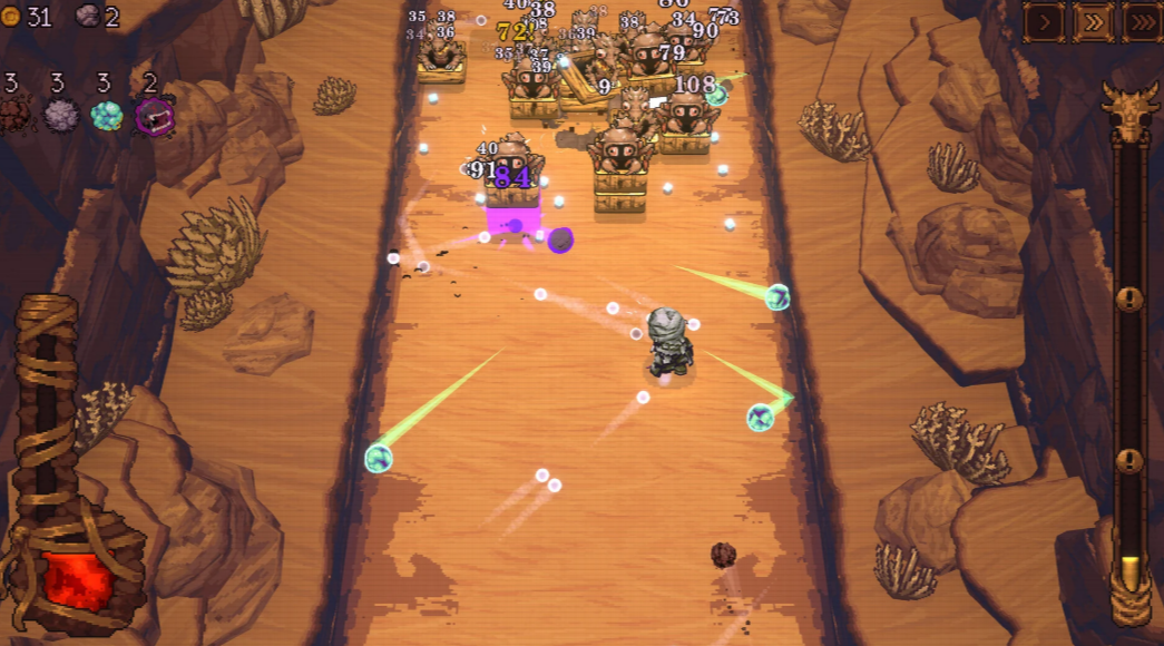 单局游戏时长稳定在12至15分钟区间,节奏紧凑且具备强重复可玩性。关卡设计覆盖沙漠、冰窟等多元地貌,终局设有巨型BOSS战。由于局内技能升级节点、弹珠获取选项均为动态随机生成,每次闯关的构筑策略与战斗体验均有差异,契合Roguelike类游戏的核心乐趣。
